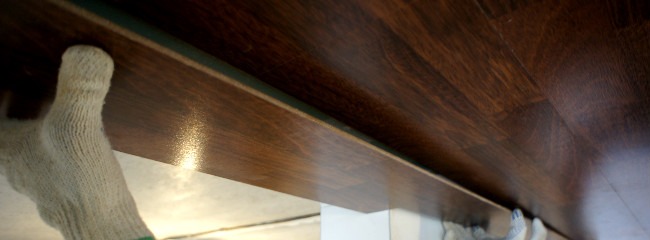 Изначально, до укладки ламината, необходимо оборудовать место каркасом. После установки приступать к непосредственной укладке. Для закрепления применяются небольшие гвоздики. От стены необходимо оставить двухсантиметровый зазор, поскольку далее это место нужно декоративно оснастить.