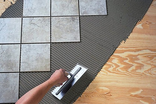 Приблизительно на площадь в 1 м2 наносится клей, гребенчатым шпателем регулируется равномерный слой, на него укладывается плитка. Лучше сразу же уровнем проверить горизонтальность кладки. В случае отступления от линии разметки при помощи резинового молотка исправить неточность. Далее кладется вторая плитка, также проверяется уровнем и направляется молотком. Все, между плитками можно ставить два крестика для соблюдения ровного шва (сейчас мастера не вставляют крестики по углам плиток, а размещают их по два между плитками).