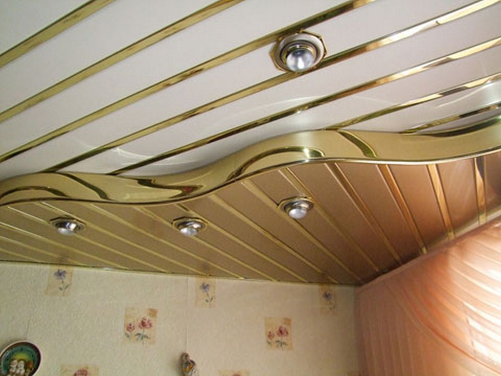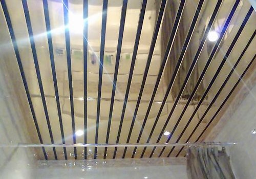 Матовый потолок не пускает блики, поэтому в ванной комнате можно спокойно устанавливать любое освещение. Зеркальные помогают при помощи освещения создавать оригинальные световые эффекты. Ламинированные потолки смотрятся эффектно и престижно, только перед покупкой стоит уточнить, насколько сильно они подвержены воздействию влажности. На сегодняшний день особую популярность среди покупателей начинают набирать панели (рейки), изготовленные на основе меди, золота, хрома. Они создают эффект расширения ванного помещения.