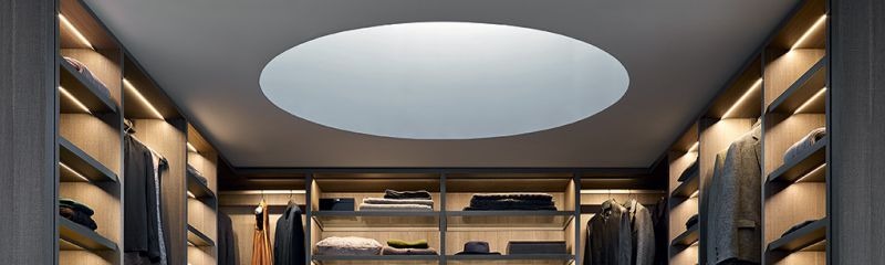 Потолок рекомендовано делать натяжной, а лучше всего, если он будет глянцевым и создаст некоторую изюминку в дизайне гардеробной.