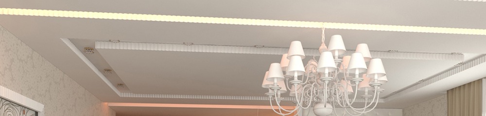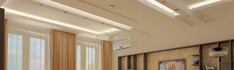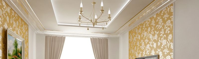 Остановив свой выбор на подвесном потолке, можно добиться изысканного внешнего вида благодаря отказу от традиционной горизонтальной плоскости. К тому же, осуществляя ремонт зала, лучше использовать несколько светильников местного освещения. Это дает эффект дополнительного разграничения пространства комнаты. За счет отказа от массивной центральной люстры можно визуально увеличить высоту потолка.