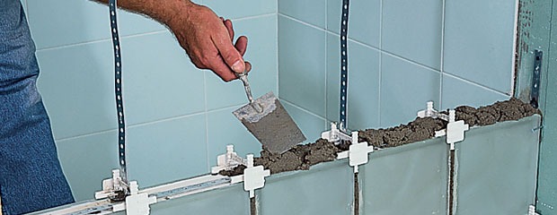 Прежде чем приступать к строительству, необходимо подготовить основание для будущей стены. Оно должно быть обязательно ровным и не иметь даже мелких дефектов и ям. Если пол имеет наклон, то на нем категорически запрещено возводить стеклоблочную стену. Проверить ровность основания можно с помощью обычного строительного уровня. После этого на полу и стене, к которой будут прилегать стеклоблоки, на клей устанавливают направляющие. С помощью клея устраняются также все неровности между планками и поверхностями, на которых они будут размещаться. Укладка стеклоблоков может начинаться лишь тогда, когда клеящий материал под планками будет полностью сухим и затвердевшим.